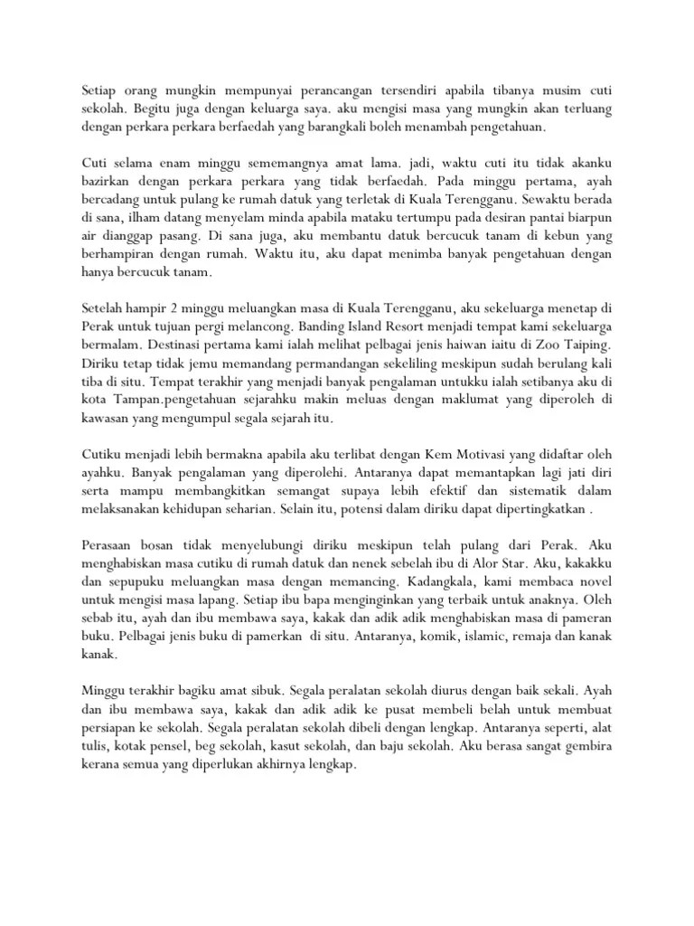 Contoh karangan aktiviti semasa cuti sekolah donskia. Karangan activiti cuti sekolah by kuek9118. Diri saya dan merupakan aktiviti bermanfaat semasa cuti sekolah. Contextual translation of semasa di kampung into .